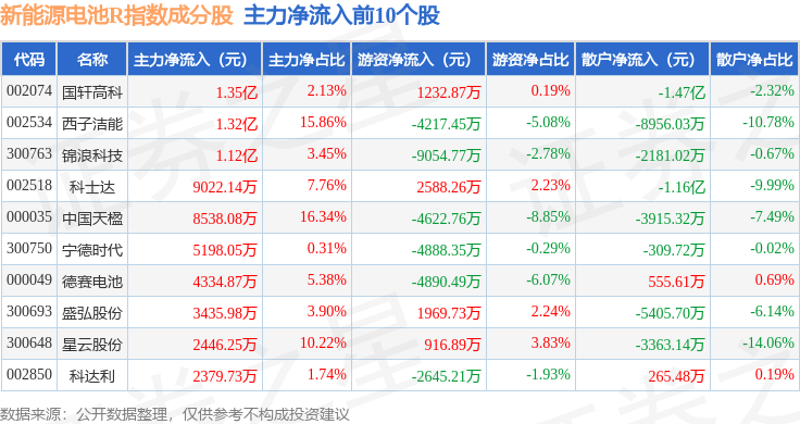 资金流向方面,新能源电池R(480027)指数成份股当日主力资金净流出合计34.79亿元,游资资金净流入合计15.75亿元,散户资金净流入合计19.04亿元。成份股资金流向详情见下表: