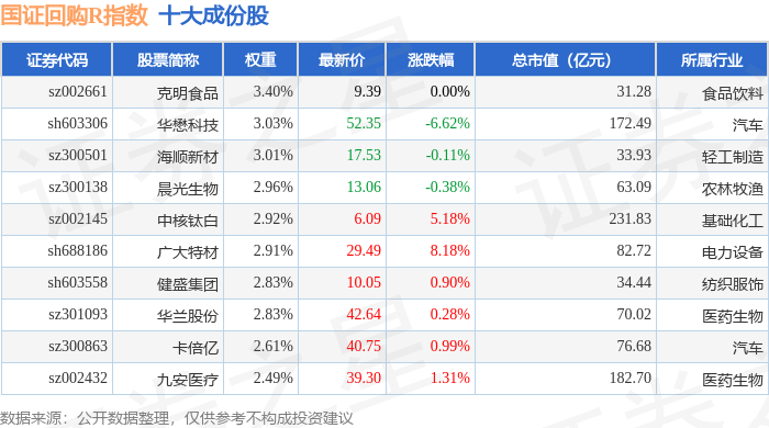 证券之星消息,10月9日,国证回购R(480063)指数报收于3891.54点,涨0.63%,成交167.32亿元,换手率1.63%。当日该指数成份股中,上涨的有29家,大名城以8.48%的涨幅领涨,下跌的有17家,华懋科技以6.62%的跌幅领跌。