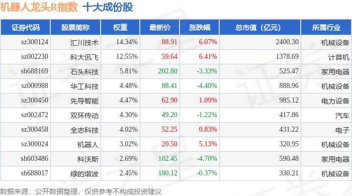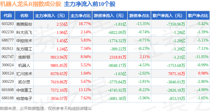 资金流向方面,机器人龙头R(480071)指数成份股当日主力资金净流出合计17.42亿元,游资资金净流入合计7.1亿元,散户资金净流入合计10.33亿元。成份股资金流向详情见下表: