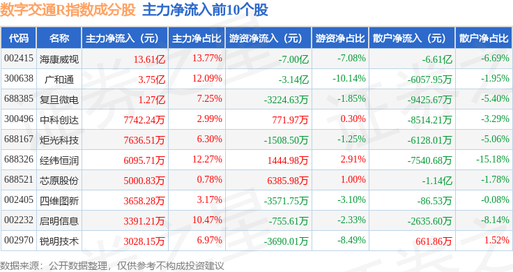资金流向方面,数字交通R(480075)指数成份股当日主力资金净流入合计7.49亿元,游资资金净流出合计7.61亿元,散户资金净流入合计1184.67万元。成份股资金流向详情见下表: