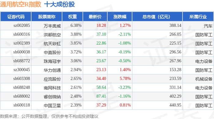 证券之星消息,10月9日,通用航空R(480076)指数报收于3685.39点,涨1.26%,成交303.08亿元,换手率2.46%。当日该指数成份股中,上涨的有38家,西部超导以20.0%的涨幅领涨,下跌的有11家,南网科技以3.23%的跌幅领跌。