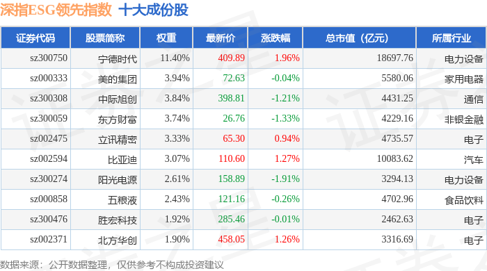 证券之星消息,10月9日,深指ESG领先(970029)指数报收于14734.46点,涨1.62%,成交4504.87亿元,换手率2.65%。当日该指数成份股中,上涨的有144家,迈为股份以17.75%的涨幅领涨,下跌的有55家,芒果超媒以6.68%的跌幅领跌。