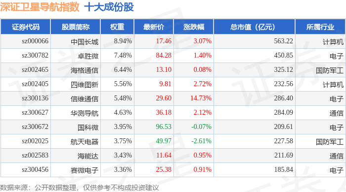 证券之星消息,10月9日,深证卫星导航(970050)指数报收于3308.6点,涨1.68%,成交215.38亿元,换手率4.15%。当日该指数成份股中,上涨的有34家,信维通信以14.73%的涨幅领涨,下跌的有7家,普天科技以4.25%的跌幅领跌。