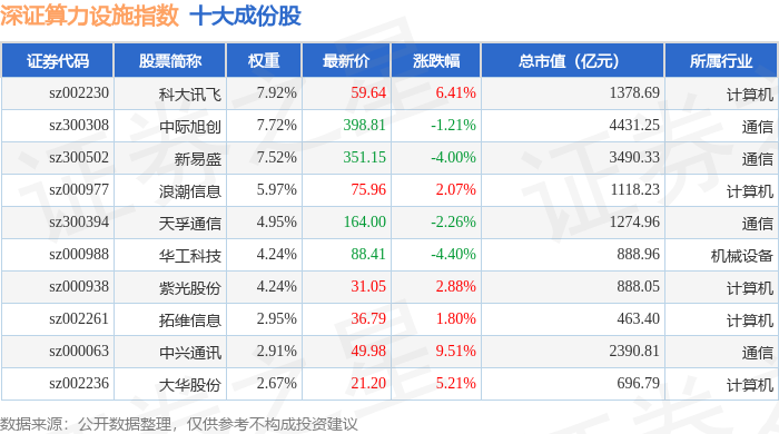 深证算力设施(970051)指数十大成份股详情如下: