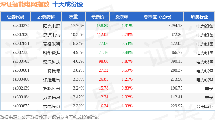 证券之星消息,10月9日,深证智能电网(970054)指数报收于3857.84点,涨0.79%,成交474.07亿元,换手率5.05%。当日该指数成份股中,上涨的有31家,英杰电气以20.01%的涨幅领涨,下跌的有19家,中恒电气以6.19%的跌幅领跌。