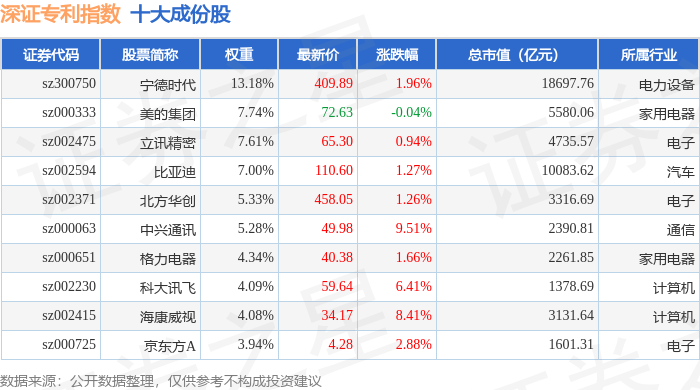 证券之星消息,10月9日,深证专利(970067)指数报收于5249.14点,涨2.67%,成交1812.19亿元,换手率3.26%。当日该指数成份股中,上涨的有39家,中兴通讯以9.51%的涨幅领涨,下跌的有11家,华策影视以13.56%的跌幅领跌。