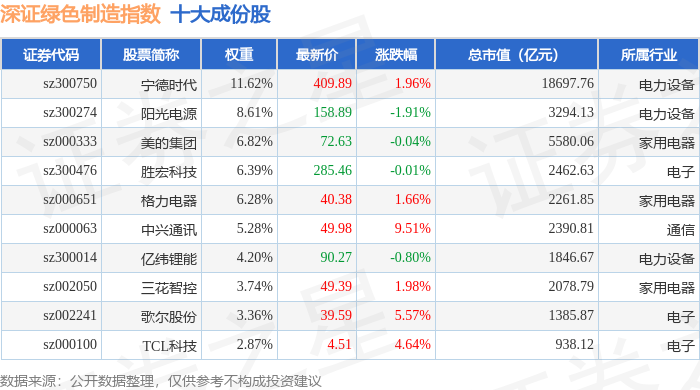 证券之星消息,10月9日,深证绿色制造(970069)指数报收于1967.73点,涨2.14%,成交1704.66亿元,换手率3.65%。当日该指数成份股中,上涨的有38家,国瓷材料以11.56%的涨幅领涨,下跌的有12家,阳光电源以1.91%的跌幅领跌。