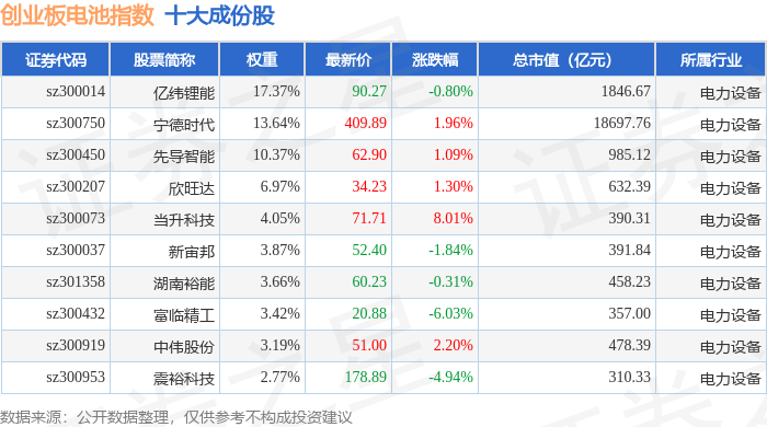 证券之星消息,10月9日,创业板电池(970081)指数报收于3754.82点,涨0.62%,成交787.19亿元,换手率7.16%。当日该指数成份股中,上涨的有25家,海科新源以20.02%的涨幅领涨,下跌的有17家,富临精工以6.03%的跌幅领跌。