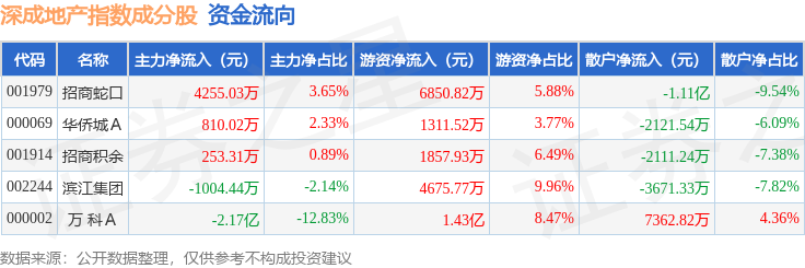 资金流向方面,深成地产(971001)指数成份股当日主力资金净流出合计1.74亿元,游资资金净流入合计2.9亿元,散户资金净流出合计1.16亿元。成份股资金流向详情见下表: