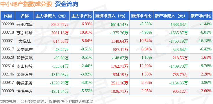 资金流向方面,中小地产(971002)指数成份股当日主力资金净流入合计6783.67万元,游资资金净流出合计467.75万元,散户资金净流出合计6315.92万元。成份股资金流向详情见下表: