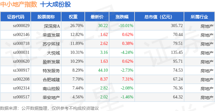证券之星消息,10月9日,中小地产(971002)指数报收于1473.56点,跌2.81%,成交29.07亿元,换手率3.33%。当日该指数成份股中,上涨的有4家,合肥城建以7.31%的涨幅领涨,下跌的有5家,深深房A以10.01%的跌幅领跌。