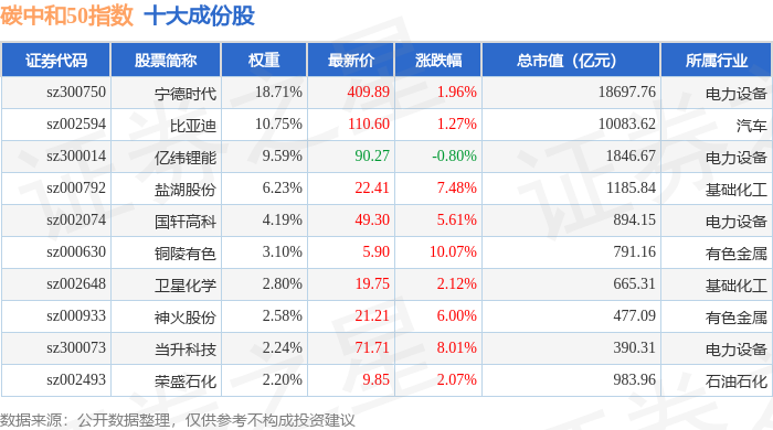 证券之星消息,10月9日,碳中和50(980021)指数报收于2330.16点,涨2.8%,成交820.53亿元,换手率2.04%。当日该指数成份股中,上涨的有39家,浙富控股以10.12%的涨幅领涨,下跌的有11家,鹏辉能源以4.41%的跌幅领跌。