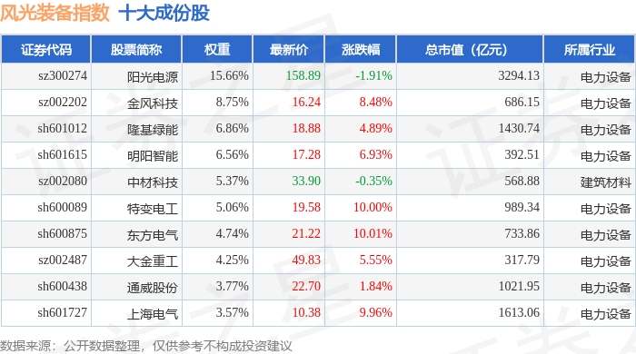 证券之星消息,10月9日,风光装备(980026)指数报收于1727.88点,涨3.92%,成交590.72亿元,换手率3.43%。当日该指数成份股中,上涨的有28家,东方电气以10.01%的涨幅领涨,下跌的有2家,阳光电源以1.91%的跌幅领跌。