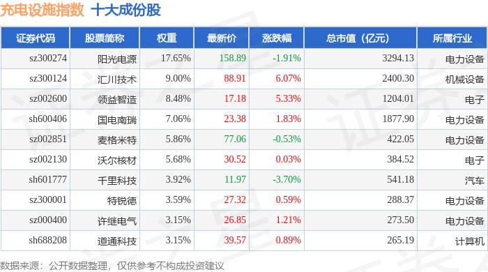 充电设施(980077)指数十大成份股详情如下: