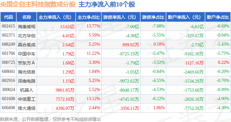 资金流向方面,央国企自主科技(980083)指数成份股当日主力资金净流出合计21.2亿元,游资资金净流入合计9.01亿元,散户资金净流入合计12.19亿元。成份股资金流向详情见下表: