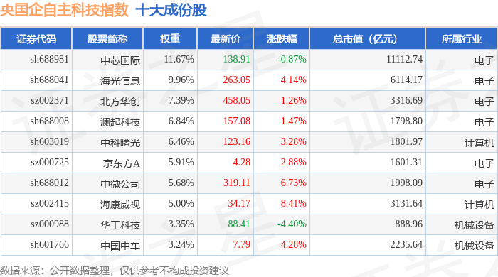 证券之星消息,10月9日,央国企自主科技(980083)指数报收于2002.04点,涨2.81%,成交1502.16亿元,换手率2.83%。当日该指数成份股中,上涨的有44家,晶合集成以13.92%的涨幅领涨,下跌的有6家,华工科技以4.4%的跌幅领跌。