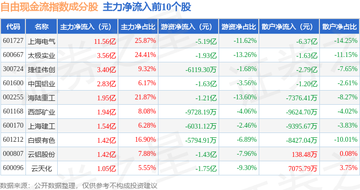 资金流向方面,自由现金流(980092)指数成份股当日主力资金净流入合计22.58亿元,游资资金净流出合计15.62亿元,散户资金净流出合计6.96亿元。成份股资金流向详情见下表: