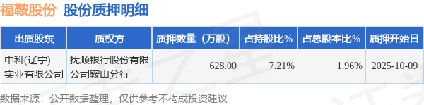 证券之星消息,福鞍股份(603315)10月9日公开信息显示,股东中科(辽宁)实业有限公司向抚顺银行股份有限公司鞍山分行合计质押628.0万股,占总股本1.96%。质押详情见下表: