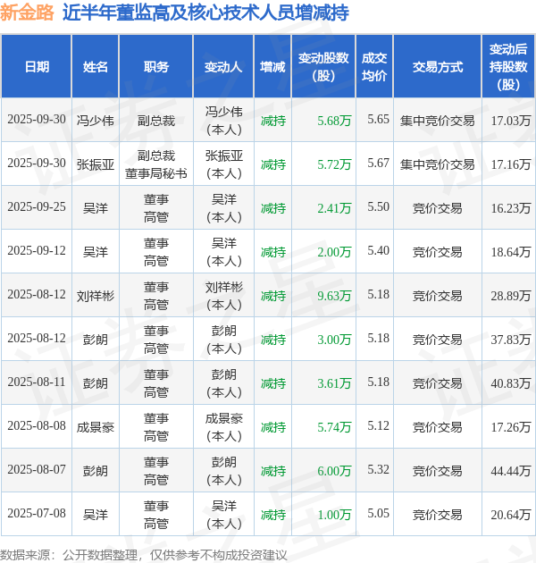 新金路近半年内的董监高及核心技术人员增减持详情如下: