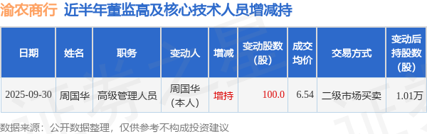 渝农商行近半年内的董监高及核心技术人员增减持详情如下: