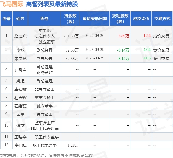 飞马国际的高管列表及最新持股情况如下: