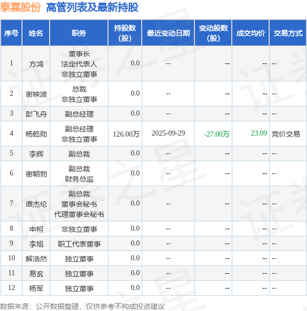 证券之星消息,根据10月9日市场公开信息、上市公司公告及交易所披露数据整理,泰嘉股份(002843)最新董监高及相关人员股份变动情况:2025年9月30日公司董事,高管杨乾勋共减持公司股份4.5万股,占公司总股本为0.0179%。变动期间公司股价上涨1.81%,9月30日当日收盘报23.6元。