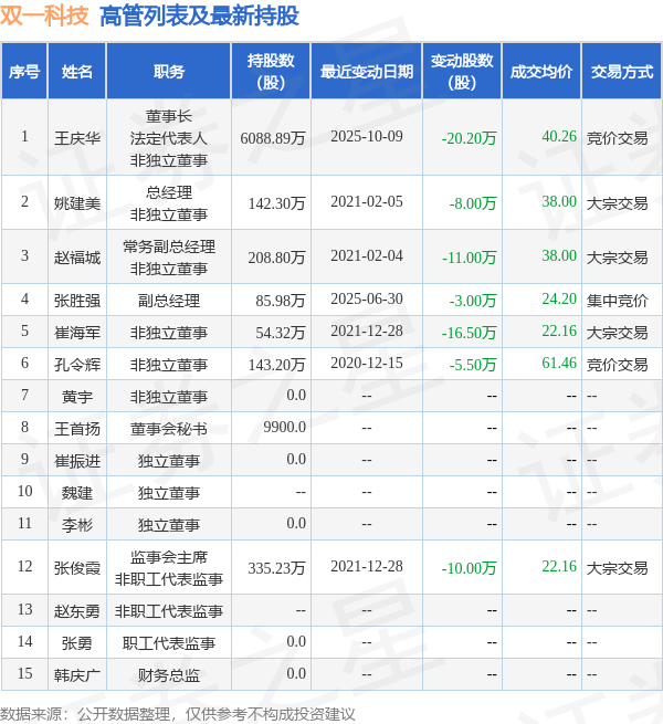 双一科技近半年内的董监高及核心技术人员增减持详情如下: