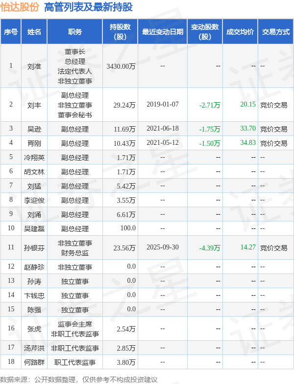 怡达股份的高管列表及最新持股情况如下: