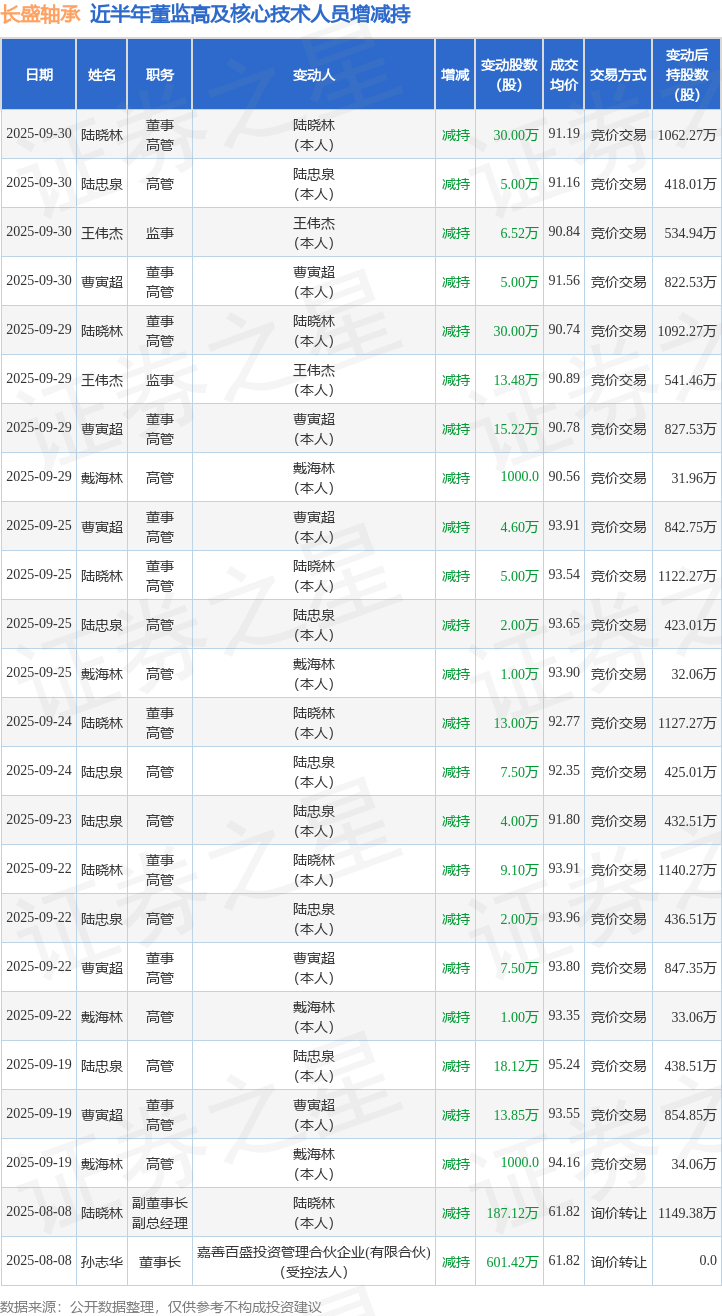 长盛轴承近半年内的董监高及核心技术人员增减持详情如下: