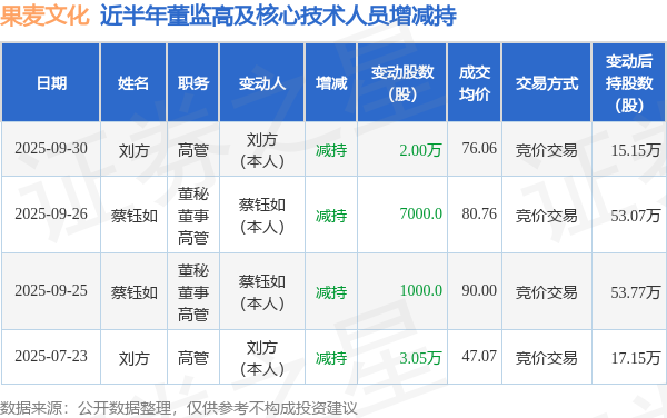 果麦文化近半年内的董监高及核心技术人员增减持详情如下: