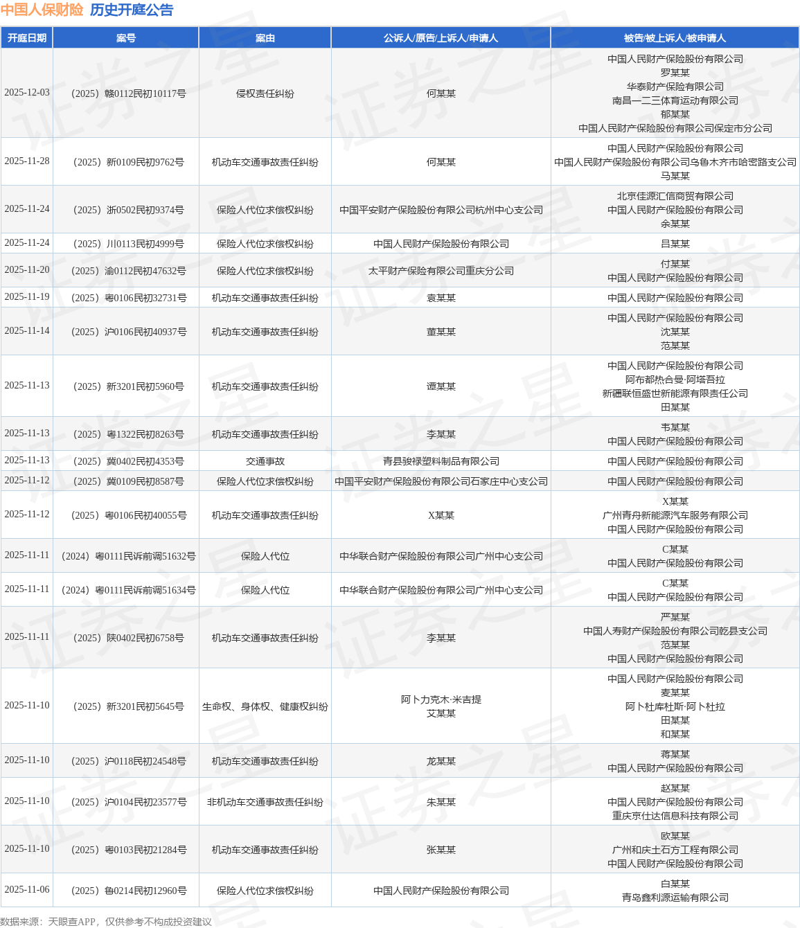 案号:(2025)新2327民初3381号根据统计,近一年内以中国人民财产保险股份有限公司为当事人的历史开庭公告有2107则,其中案由为“机动车交通事故责任纠纷”的公告以1447则居首,其次为“保险人代位求偿权纠纷”有153则,“交通事故”有84则。历史开庭公告(前20条)如下: