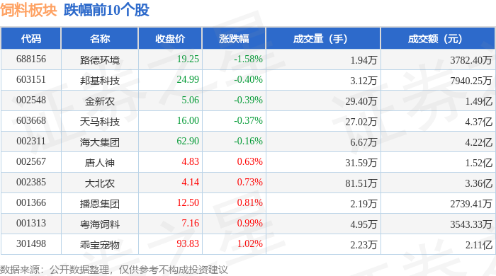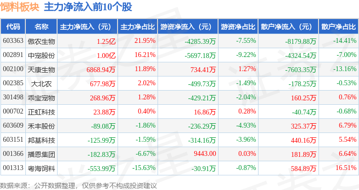 从资金流向上来看,当日饲料板块主力资金净流入2.1亿元,游资资金净流出9204.2万元,散户资金净流出1.18亿元。饲料板块个股资金流向见下表: