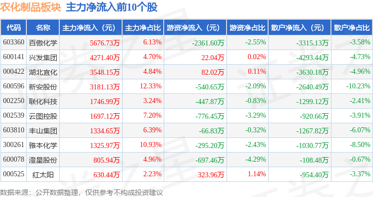 从资金流向上来看,当日农化制品板块主力资金净流出7.04亿元,游资资金净流入1.6亿元,散户资金净流入5.45亿元。农化制品板块个股资金流向见下表: