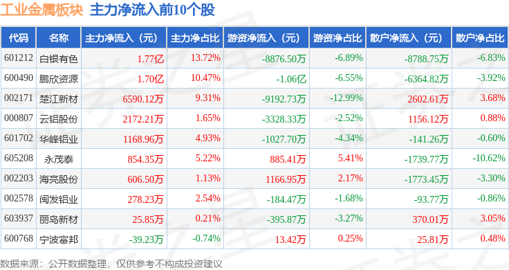 从资金流向上来看,当日工业金属板块主力资金净流出66.39亿元,游资资金净流入12.0亿元,散户资金净流入54.39亿元。工业金属板块个股资金流向见下表: