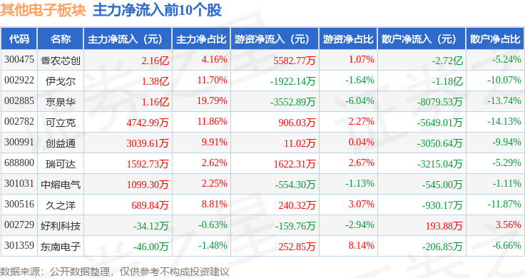 从资金流向上来看,当日其他电子板块主力资金净流出4.01亿元,游资资金净流入2.14亿元,散户资金净流入1.87亿元。其他电子板块个股资金流向见下表: