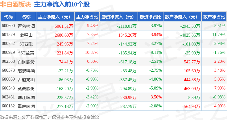 从资金流向上来看,当日非白酒板块主力资金净流入3359.04万元,游资资金净流出5553.93万元,散户资金净流入2194.89万元。非白酒板块个股资金流向见下表: