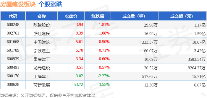证券之星消息,10月10日房屋建设板块较上一交易日上涨0.5%,陕建股份领涨。当日上证指数报收于3897.03,下跌0.94%。深证成指报收于13355.42,下跌2.7%。房屋建设板块个股涨跌见下表: