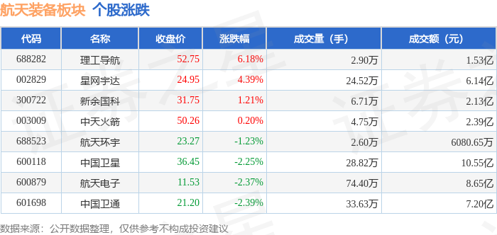 证券之星消息,10月10日航天装备板块较上一交易日下跌1.79%,中国卫通领跌。当日上证指数报收于3897.03,下跌0.94%。深证成指报收于13355.42,下跌2.7%。航天装备板块个股涨跌见下表: