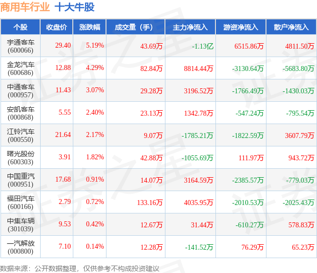 个股表现方面,商用车行业当日领涨股为宇通客车(600066),该股当日报收29.4,上涨5.19%,成交量43.69万,主力资金净流出1.13亿元。金龙汽车(600686)以上涨4.29%紧随其后,该股当日成交量82.84万,主力资金净流入8814.44万元。除此之外,中通客车(000957)、安凯客车(000868)、江铃汽车(000550)均进入当日牛股之列。具体个股列表见下表: