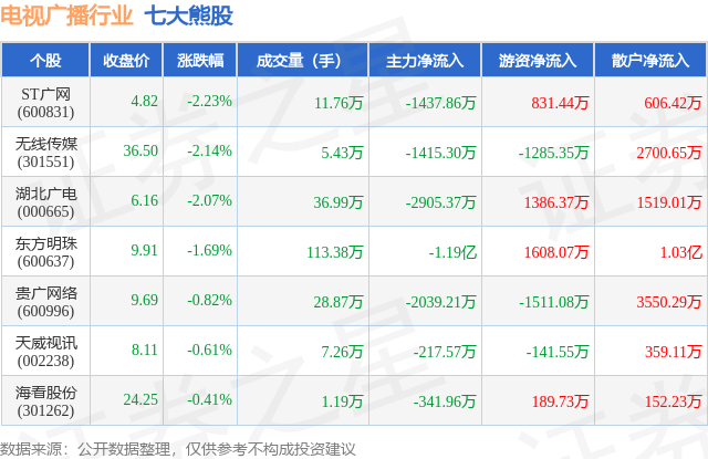 个股表现方面,电视广播行业当日领跌股为ST广网(600831),该股当日报收4.82,下跌2.23%,成交量11.76万,主力资金净流出1437.86万元。无线传媒(301551)以下跌2.14%紧随其后,该股当日成交量5.43万,主力资金净流出1415.3万元。除此之外,湖北广电(000665)、东方明珠(600637)、贵广网络(600996)均进入当日熊股之列。具体个股列表见下表: