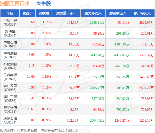 个股表现方面,油服工程行业当日领涨股为中油工程(600339),该股当日报收3.68,上涨3.37%,成交量104.53万,主力资金净流出2885.21万元。惠博普(002554)以上涨2.66%紧随其后,该股当日成交量38.15万,主力资金净流入38.2万元。除此之外,中曼石油(603619)、中海油服(601808)、石化油服(600871)均进入当日牛股之列。具体个股列表见下表: