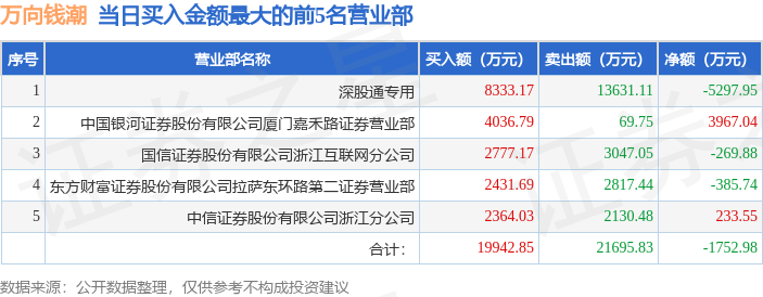 从龙虎榜公布的当日买卖数据来看,北向资金合计净卖出5297.95万元。