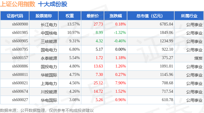上证公用(000041)指数十大成份股详情如下: