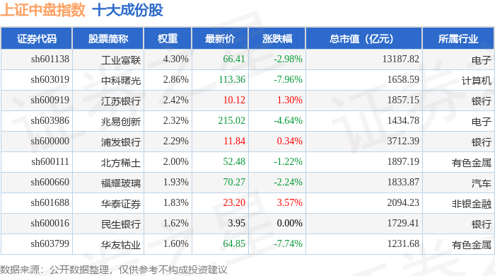 证券之星消息,10月10日,上证中盘(000044)指数报收于4638.41点,跌1.03%,成交2201.47亿元,换手率1.32%。当日该指数成份股中,上涨的有64家,江西铜业以7.84%的涨幅领涨,下跌的有61家,华勤技术以8.76%的跌幅领跌。