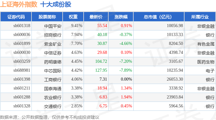 证券之星消息,10月10日,上证海外(000054)指数报收于1531.73点,跌0.76%,成交1542.73亿元,换手率0.54%。当日该指数成份股中,上涨的有40家,江西铜业以7.84%的涨幅领涨,下跌的有19家,中芯国际以7.89%的跌幅领跌。