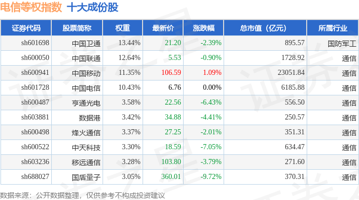 证券之星消息,10月10日,电信等权(000078)指数报收于3297.35点,跌1.76%,成交242.79亿元,换手率0.89%。当日该指数成份股中,上涨的有11家,山东出版以1.69%的涨幅领涨,下跌的有18家,国盾量子以9.72%的跌幅领跌。