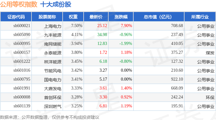 证券之星消息,10月10日,公用等权(000079)指数报收于2622.88点,涨1.21%,成交201.77亿元,换手率1.3%。当日该指数成份股中,上涨的有21家,上海电力以7.9%的涨幅领涨,下跌的有7家,南网储能以1.99%的跌幅领跌。