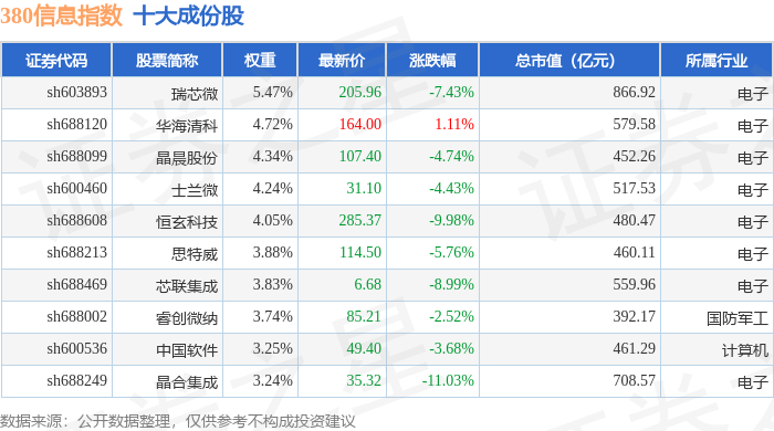 证券之星消息,10月10日,380信息(000111)指数报收于10402.85点,跌4.46%,成交507.25亿元,换手率3.88%。当日该指数成份股中,上涨的有5家,至纯科技以6.88%的涨幅领涨,下跌的有41家,晶合集成以11.03%的跌幅领跌。