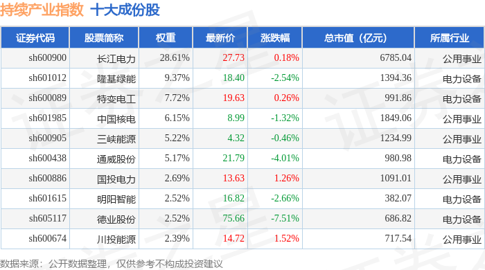 证券之星消息,10月10日,持续产业(000114)指数报收于1249.96点,跌1.28%,成交364.15亿元,换手率1.3%。当日该指数成份股中,上涨的有15家,华能水电以1.78%的涨幅领涨,下跌的有23家,德业股份以7.51%的跌幅领跌。