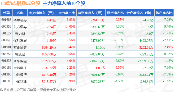 资金流向方面,180动态(000123)指数成份股当日主力资金净流出合计184.14亿元,游资资金净流入合计86.12亿元,散户资金净流入合计98.02亿元。成份股资金流向详情见下表: